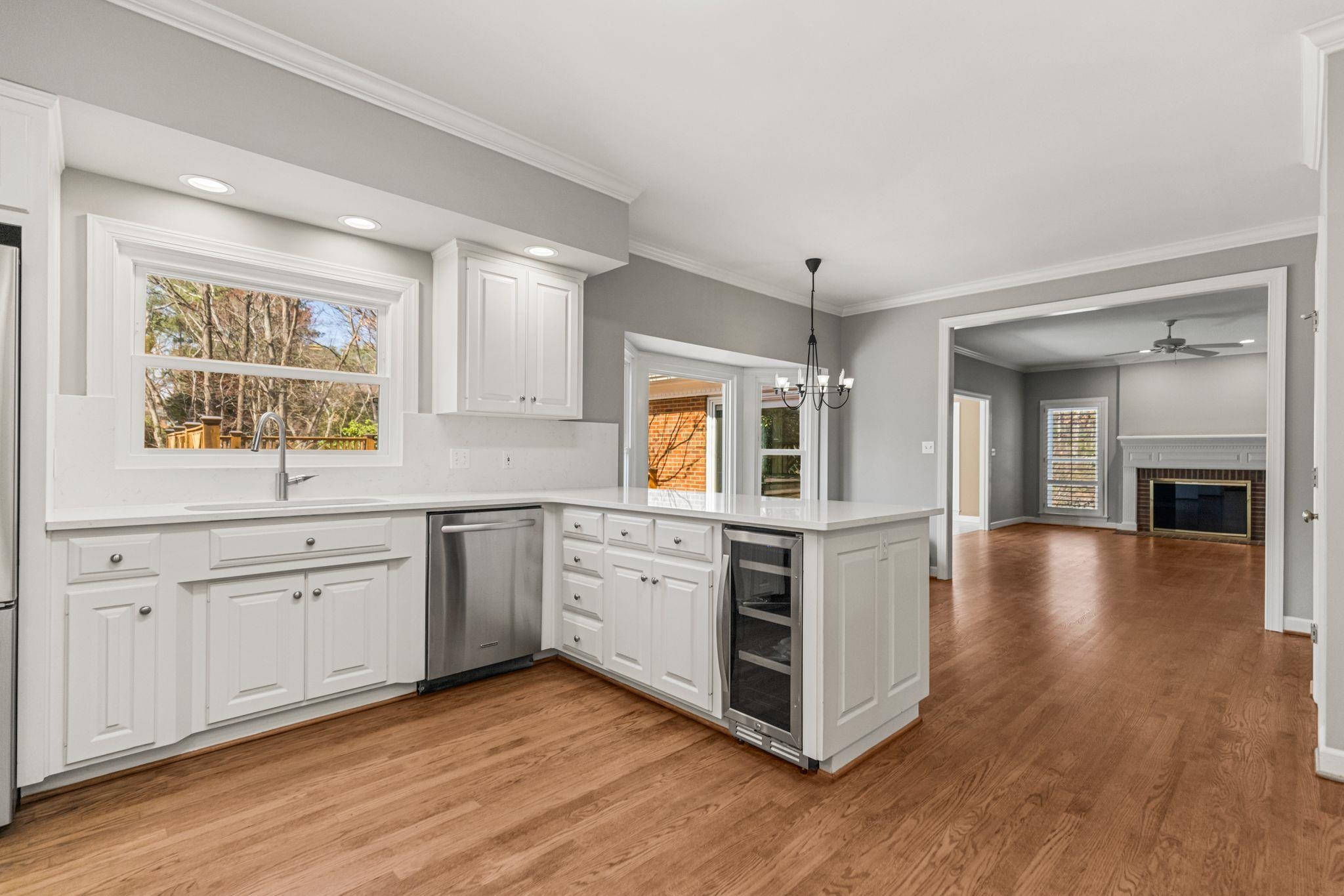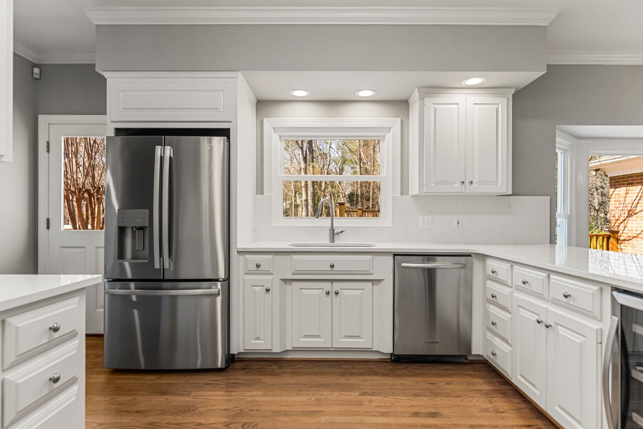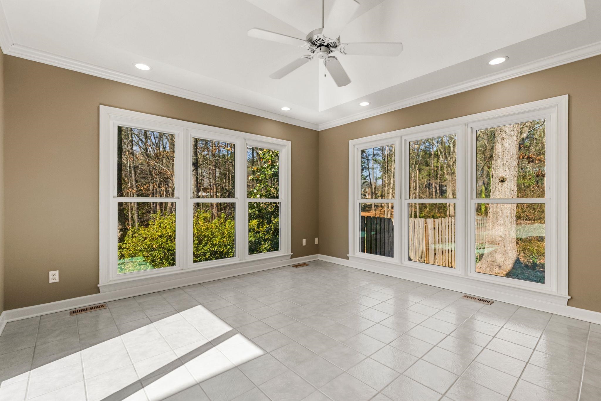 Beautifully updated home in the desirable Woodridge neighborhood on Spartanburg’s Westside featuring refinished hardwood floors, renovated primary suite, quartz kitchen upgrades, tankless Rinnai gas water heater, and extensive smart-home features. This move-in ready home has been thoughtfully improved throughout with fresh interior paint, brand new pet-resistant carpet upstairs, high-efficiency windows with transferable warranty, and Lennox Elite HVAC systems serving both floors. The main living areas offer a comfortable and inviting flow. The family room features a woodburning fireplace with gas starter, raised panel mantel, brick surround, plantation shutters, recessed lighting, and ceiling fan. Just beyond, the sunroom with tray ceiling and sliding doors to the deck creates a bright space for relaxing or entertaining. The kitchen has been beautifully refreshed with new quartz countertops, full-height backsplash, freshly painted cabinetry inside and out, new hardware, and new stainless undermount sinks. Appliances include a new GE French door refrigerator, beverage center, GE downdraft cooktop, double ovens, and dishwasher. Smart home light switches and under-cabinet lighting add convenience, while a nearby wet bar area makes entertaining easy. The dining room includes a large built-in buffet/china cabinet providing both storage and charm. Upstairs, the primary suite has been completely renovated and offers a true retreat with heated tile flooring, oversized Pelham & White freestanding soaking tub, new tile shower with glass door, quartz double vanity with new lighting, and smart TV above the tub. Additional features include tile wainscoting, Bluetooth-enabled bath fan with lighting and speaker, and thoughtful storage including a large closet with locking door. Additional bedrooms feature large closets and ceiling fans, while the FROG provides flexible space to use as a media room, or guest suite with durable high-traffic flooring and excellent storage. Outdoor living is just as impressive with multi-level decks, new decking on the upper level, and freshly stained decking throughout. The backyard has new sod and a full irrigation system for both front and back yards. Beneath the upper deck is a large storage/workshop space with infrared heater that conveys. Additional highlights include Tankless Rinnai gas water heater, Nest learning thermostats on both floors, High-efficiency windows with transferable warranty, MyQ Wi-Fi garage door openers with phone control, Double garage plus extra refrigerator in garage to convey if desired. There is also a pre-paid HVAC maintenance service with CJ Compton Heating & Air. Located in the established Woodridge community, this Westside Spartanburg neighborhood is known for its mature landscaping, strong sense of community, and convenient access to shopping, dining, schools, and major commuting routes. This home offers the kind of spaces that make everyday living feel a little more special.